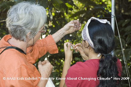 In addition, the show includes "How We Know About Our Changing Climate: Learning and Taking Action on Climate Change", an educational exhibit and video installation. Images from the middle-school science book "How We Know What We Know About Our Changing Climate: Scientists and Kids Explore Global Warming" and the short films from the "Young Voices for the Planet" collection (see Related Summaries, below) are designed to teach and inspire school groups and families. Here, the images include scientists at work, youth participating in research (like Project Budburst), and children who have been affected by climate change, such as one of 3 children sitting on a porch in the island nation of Tuvalu looking out at their flooded neighbourhood. Lynne Cherry is co-author with Braasch of the middle-school science book and producer/director of the films.