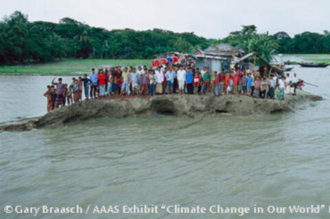 This initiative uses photography in an effort to engage viewers as witnesses to the effects of global warming today, including solutions and actions that are underway by governments, companies, families, and children. While there are the familiar images of climate change - polar bears, penguins, and disappearing glaciers - there are also others that are less known, such as Bangladeshi villagers perched on the end of a road being washed away by erosion and children playing in an empty rice field in a China besieged by drought. The images are by environmental photojournalist Gary Braasch, winner of the Ansel Adams Award, who has been documenting climate change and its solutions for more than a decade. The exhibit is designed to be visually arresting, with 5-foot-high prints, and with detailed captions communicating the message that the atmosphere is warming rapidly and has widespread effects. It illustrates the steps we must take to limit the warming and effects. There are also solutions, like examples of green building and a line of modern windmills in the Netherlands.