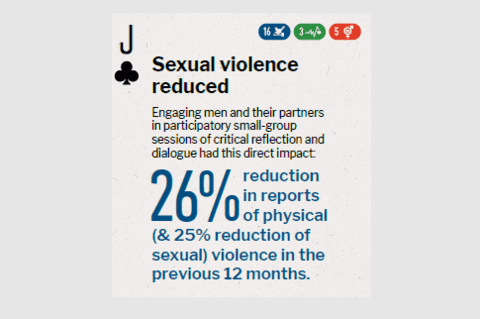 Strategy researched Engaging men and their partners in participatory, small-group sessions of critical reflection and dialogue Impact achieved Country of study Rwanda Research methodology Multisite RCT Journal Journal paper title and link Excerpt from Abstract "The Bandebereho intervention led to substantial improvements in multiple reported outcomes. Compared to the control group, women in the intervention group reported: less past-year physical (OR 0.37, p<0.001) and sexual IPV (OR 0.34, p<0.001); and greater attendance (IRR 1.09, p<0.001) and male accompaniment at antenatal care (IRR 1.50, p<0.001); and women and men in the intervention group reported: less child physical punishment (women: OR 0.56, p = 0.001; men: OR 0.66, p = 0.005); greater modern contraceptive use (women: OR 1.53, p = 0.004; men: OR 1.65, p = 0.001); higher levels of men's participation in childcare and household tasks (women: beta 0.39, p<0.001; men: beta 0.33, p<0.001); and less dominance of men in decision-making." |