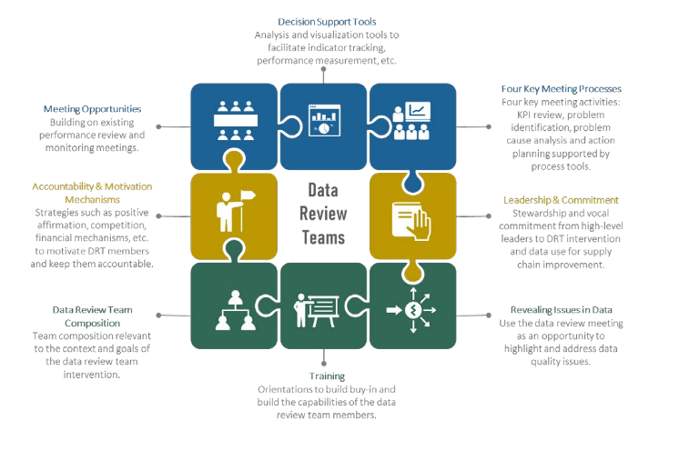 Well-performing immunisation supply chains (iSC) are critical to ensure vaccine availability, and they rely heavily on data visibility and data use to function properly. Data review teams (DRTs) provide an opportunity for stakeholders from across supply chain tiers to review key iSC performance indicators (KPIs), identify and assess performance issues, and develop actionable solutions for improving iSC and immunisation programme performance. This synthesis report offers a cross-country analysis of vaccine-related DRT interventions carried out by the Clinton Health Access Initiative (CHAI) in 7 countries, John Snow, Inc. (JSI) in 10 countries, and VillageReach in 3 countries. Because DRT interventions share characteristics that are common to many other health systems strengthening approaches - that is, they focus on instilling and institutionalising new practices and behaviours among stakeholders within the health system - lessons drawn from DRTs may be relevant to other types of interventions as well.