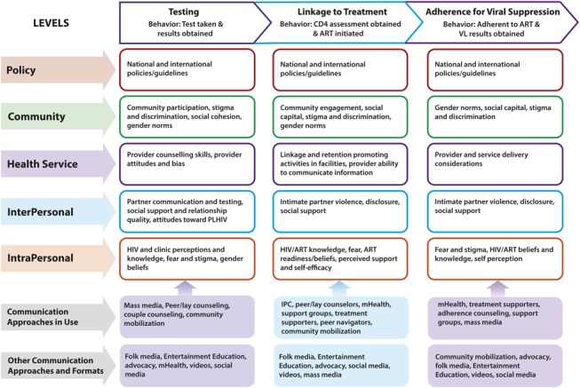 The conceptual framework and evidence presented highlight areas across the continuum where health communication can significantly impact treatment outcomes to reach the Joint United Nations Programme on HIV/AIDS (UNAIDS) 90-90-90 goals [that 90% of all PLHIV know their status, 90% of all diagnosed PLHIV receive ART, and 90% of all persons receiving ART achieve viral suppression] by strategically addressing key behavioural determinants. The top row in the model presents the desired behaviours at each of the 3 key stages of the continuum. The determinants of behaviour operate at multiple levels. From top to bottom, these levels include national policy, community, services, interpersonal, and intrapersonal levels. At each level and for each behaviour, determinants include both facilitators and barriers, with communication interventions designed to focus on specific determinants presented in the model. The last row of the model presents health communication interventions found in the articles reviewed, as well as the suggested approaches that address the identified determinants (see Supplemental Digital Content 1 for more information on the included interventions).