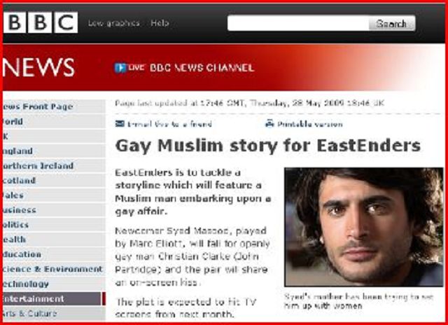 To illustrate the importance of understanding how mass media in the developed world reflects and presents the family in its broadest sense, the author discusses what was then an upcoming story on the BBC soap opera EastEnders concerning a gay Muslim. There was a telephone number after the end sequence for "viewers affected by the issues presented in this programme". According to the author, initial reaction to the storyline demonstrates how discussion had already opened up - even prior to broadcast.
