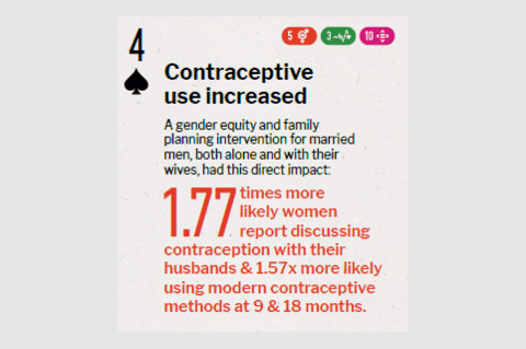 Strategy researched A gender equity and family planning intervention for married men, both alone and with their wives Impact achieved Country of study India Research methodology Cluster RCT Journal Journal paper title and link Excerpt from Abstract "A two-armed cluster randomized controlled trial was conducted with young married couples (N = 1081 couples) recruited from 50 geographic clusters (25 clusters randomized to CHARM and a control condition, respectively) in rural Maharashtra, India. Couples were surveyed on demographics, contraceptive behaviors, and intimate partner violence (IPV) attitudes and behaviors at baseline and 9 &18-month follow-ups, with pregnancy testing at baseline and 18-month follow-up. Outcome effects on contraceptive use and incident pregnancy, and secondarily, on contraceptive communication and men’s IPV attitudes and behaviors, were assessed using logistic generalized linear mixed models. Most men recruited from CHARM communities (91.3%) received at least one CHARM intervention session; 52.5% received the couple’s session with their wife. Findings document that women from the CHARM condition, relative to controls, were more likely to report contraceptive communication at 9-month follow-up (AOR = 1.77, p = 0.04) and modern contraceptive use at 9 and 18-month follow-ups (AORs = 1.57–1.58, p = 0.05), and they were less likely to report sexual IPV at 18-month follow-up (AOR = 0.48, p = 0.01). Men in the CHARM condition were less likely than those in the control clusters to report attitudes accepting of sexual IPV at 9-month (AOR = 0.64, p = 0.03) and 18-month (AOR = 0.51, p = 0.004) follow-up, and attitudes accepting of physical IPV at 18-month follow-up (AOR = 0.64, p = 0.02). No significant effect on pregnancy was seen." |