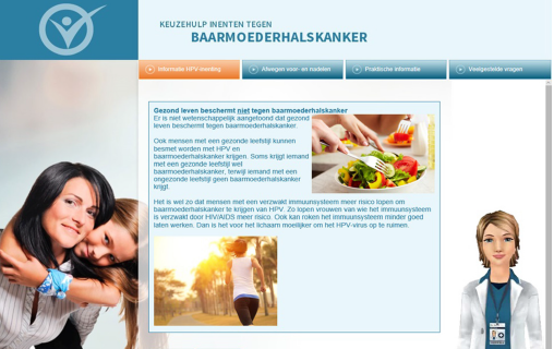 - Translation of theoretical methods into practical applications (IM Step 3): Because mothers indicated a preference for internet as the delivery mode of the information, a Web-based intervention was developed with 4 menu options: (i) 2-sided information about HPV vaccination, (ii) a decisional balance, (iii) practical information, and (iv) frequently asked questions (FAQs). Mothers could choose themselves which component in which menu they wanted to visit (i.e., freedom of choice design). However, once they entered a component, they were guided through it in "tunnel fashion". Computer tailoring was selected as the main theoretical framework for development. Tailoring is a health communication strategy by which messages are individualised to personal preferences and needs. The researchers selected virtual assistants for delivering tailored feedback. The mother-like assistant was used to guide mothers throughout the website and helped weigh their personal values in the decisional balance. As part of the effort to reduce decisional conflict through decisional balance, the mother-like assistant presented mothers with a list of pros and cons of HPV vaccination. Based on pros and cons mothers marked as most salient, a decisional balance (top right of the screen) revealed their current position on a scale ranging between not wanting (left side) and wanting (right side) to get their daughter vaccinated. The doctor-like assistant was used to deliver feedback about HPV vaccination.