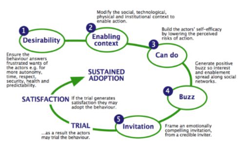 Environmental campaigns not only aim to raise awareness and create engagement, but ideally also to trigger behavioural changes - for instance by encouraging individuals to reduce their consumption of energy. Robinson developed the 5 Doors theory, which aggregates elements from Diffusion of Innovations and the Self-Determination theory of motivation, among others. Instead of promoting changes to people's beliefs or attitudes, the 5 Doors theory focuses more on "enabling relationships between people and modifying technological and social contexts". The theory consists of 5 conditions that must be present in a cycle of behaviour change (see Figure 1, above). When mapping this theory to analyse user behaviour, the authors' interpretation is that each of these conditions maps to a different behavioural stage - the assumption being that users shape their social media messages differently according to the stage in which they are at. The conditions are, in short: (i) desirability - people in this stage are motivated (desire) to reduce their frustrations (e.g., high expense on their electricity bill); (ii) anabling context - people in this stage are changing their environment (e.g., social norms) to enable a new behaviour; (iii) can do - people in this stage are already acting; (iv) positive buzz - people in this stage communicate their experiences and success stories; and (v) invitation - people in this stage invite and engage other people to their cause, perhaps by authentically modelling the change in their own lives. Since intervention strategies or tactics to nudge the user in the direction of change are generally different according to the stage in which the user is, it is important for campaigners to: (i) identify the different behavioural stages of their audiences and (ii) make sure that a campaign is covering all possible stages so that all users find support to progress.